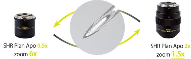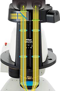 尼康新开发的光学系统即使在高倍下亦可以极大地提升了图像信噪比。此系统甚至可用于细胞分裂的拍摄,而此功能使用传统的体式显微镜是极难做到的。
